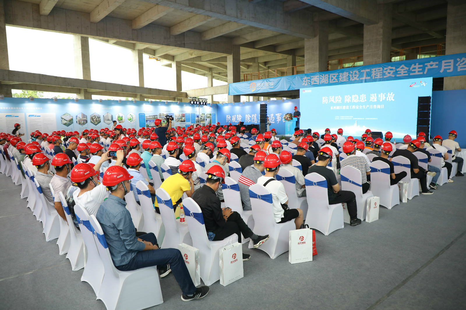 ??? 6月16日,東西湖區(qū)屬建筑施工企業(yè)和在建工程管理人員共計(jì)260余人相聚在武漢食品檢驗(yàn)檢測中心項(xiàng)目現(xiàn)場,通過觀摩現(xiàn)場安全文明情況、領(lǐng)取安全文明手冊、咨詢安全管理問題、問卷調(diào)查、觀看安全生產(chǎn)警示教育片等方式共同參與到本次安全生產(chǎn)月活動中來。此次活動呈現(xiàn)兩大亮點(diǎn):一是播放宣傳片更加貼近生活,往年的宣傳片,多半是建筑施工安全、消防安全等傳統(tǒng)教育類視頻,今年活動圍繞安全生產(chǎn)和文明施工,專門制作了《防線》、《體育中心安全文明》、《創(chuàng)杯項(xiàng)目錦集》三部宣傳片,展示了武漢市優(yōu)質(zhì)大型項(xiàng)目在施工管理上的好做法,使來賓能從中找到共鳴;二是新增了現(xiàn)場問卷答題,更注重互動性與參與性,答完題后邀請專家現(xiàn)場解答互動,對安全管理的工作疑慮進(jìn)行了有效溝通。