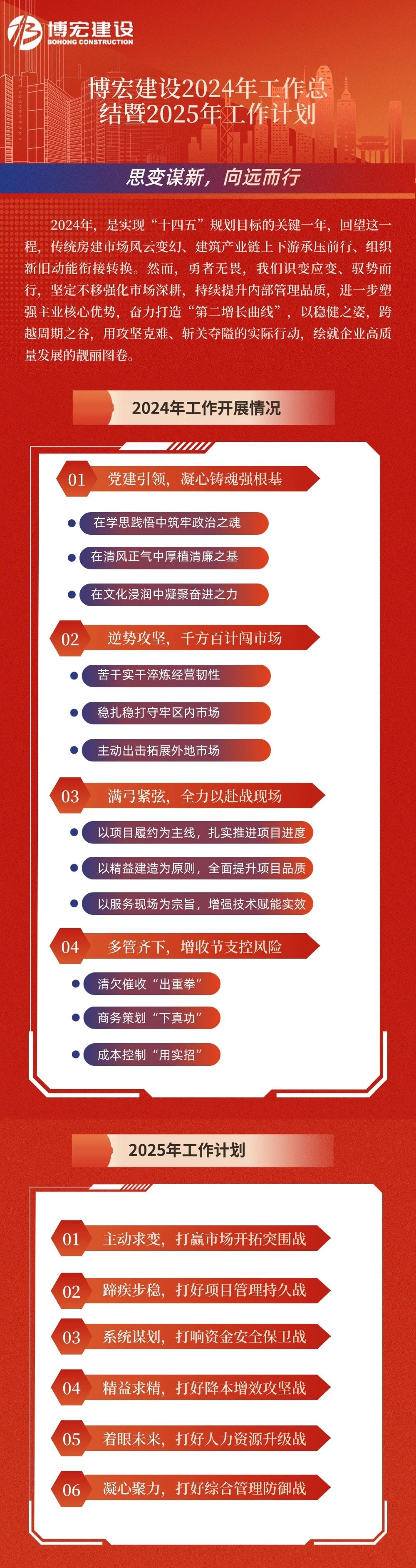 1月24日-25日,博宏建設(shè)2024年度總結(jié)表彰暨2025年工作研討會(huì)順利召開(kāi)。公司黨委班子、部門(mén)負(fù)責(zé)人、項(xiàng)目經(jīng)理和員工代表共80余人參加會(huì)議。集團(tuán)黨委書(shū)記嚴(yán)悌文、董事長(zhǎng)虞志鵬、常務(wù)副總經(jīng)理錢(qián)濤受邀出席會(huì)議。會(huì)議由公司黨委副書(shū)記郭一清主持。